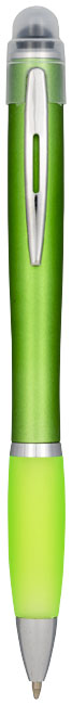 Stylo ? bille lumineux Nash avec corps color? et poign?e color?e. Stylo ? bille avec m?canisme de bouton-poussoir et grip doux au toucher. Lorsque le stylo est grav? le logo s?allume en appuyant sur le stylet. 3 piles LR41 sont incluses. Corps en plastique et accessoires.